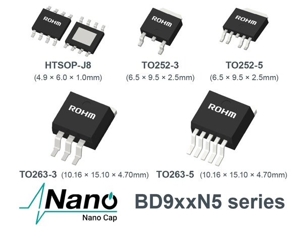 ROHM has developed the “BD9xxN5 Series” of LDO regulator ICs with 500mA output current, featuring its proprietary ultra-stable control technology “Nano Cap™”. This series comprises 18 products designed for 12V/24V primary power supply applications used in automotive equipment, industrial equipment, and communication infrastructure.